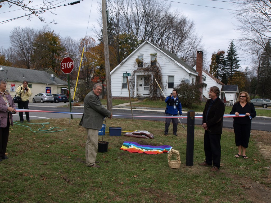 And then she was planted with fanfare at the newly created North Street Park. In she went, with songs of peace and a shovel full of dirt from the mayor. A sign indicated her presence on the plot of land. Time passed. She grew slowly, but well.